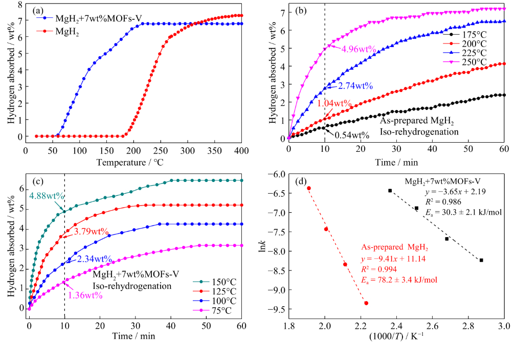 圖3. (a) MgH2和MgH2+7wt%MOFs-V復(fù)合材料在不同溫度下的吸氫曲線。(b) MgH2和(c) MgH2+7wt%MOFs-V復(fù)合材料的恒溫吸氫曲線。(d) MgH2和MgH2+7wt%MOFs-V復(fù)合材料的Arrhenius曲線擬合。