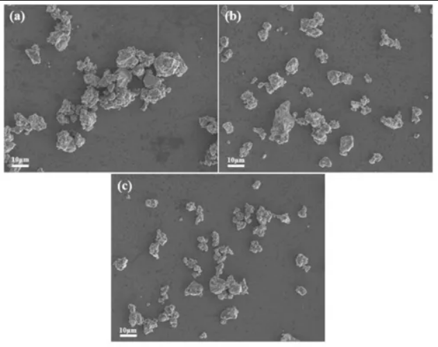 Mg2Ni合金顆粒呈現(xiàn)凹凸不平的形狀和粗糙的表面織構(gòu)。圖2(a)表明顆粒團聚和融合明顯,粒徑分布不均勻,超過10μm的顆粒普遍存在。這主要是由于球磨過程中韌性組分、鎂元素、分層和粘結(jié)造成的。球磨機的頻繁沖擊導致材料不斷破碎,少量的MWCNTs不能提供足夠的潤滑,導致顆粒尺寸變大。隨著MWCNTs用量的增加,其提供潤滑的作用更加明顯。粉末顆粒尺寸減小,團聚和焊合現(xiàn)象的發(fā)生減少。這表明摻入MWCNTs可以有效地減少團聚和融合的發(fā)生。