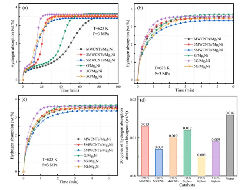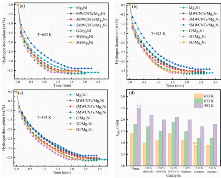 當添加量為3wt%時表現(xiàn)出最佳的吸氫性能,在475K的溫度下,在200s內(nèi)迅速達到吸氫的飽和狀態(tài),在達到吸收溫度后表現(xiàn)出穩(wěn)健的吸氫動力學。隨著5wt%MWCNTs的引入,放氫飽和溫度為545K,放氫速率也略有上升。與MWCNTs樣品相比,3G/Mg2Ni在476K左右表現(xiàn)出更冷的吸氫量,具有更強的動力學特性,可以在150s內(nèi)快速達到吸氫飽和。