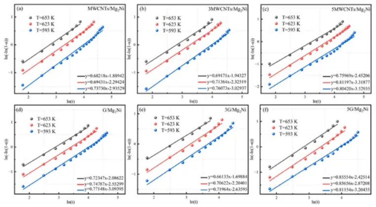MWCNTs和石墨烯的結(jié)合有效地降低了Mg2Ni合金放氫反應所需的活化能,從而提高了放氫動力學效率。特別值得注意的是,在3wt%石墨烯復合材料中,激活能最低為58.7kJ/mol,與Mg2Ni合金相比降低了約10kJ/mol。這突出了合金放氫動力學最有效的增強。